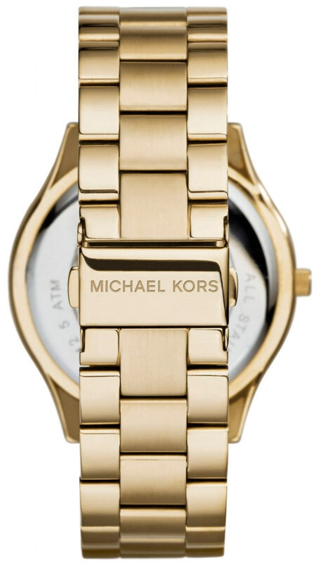Корпуса и верижката са изработени от благородна стомана с устойчиво на износване златисто покритие. Циферблата е аналогов в черен цвят със златисти индекси.