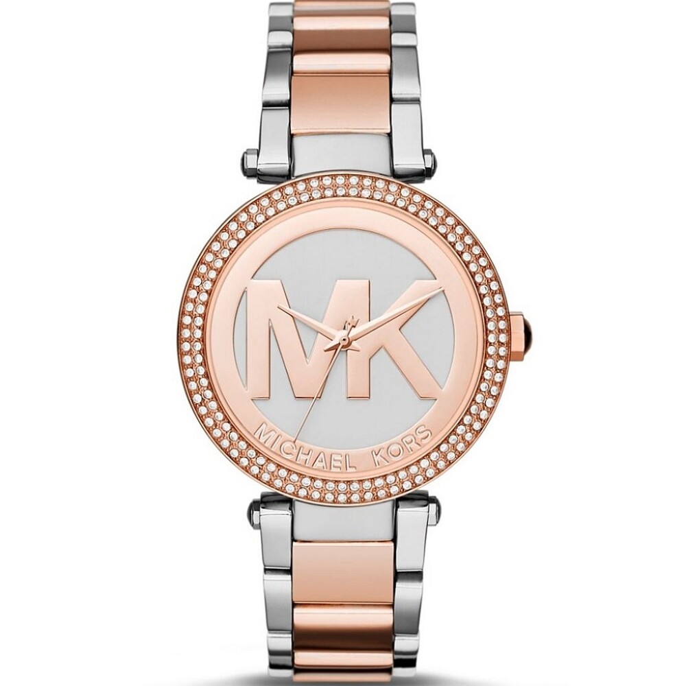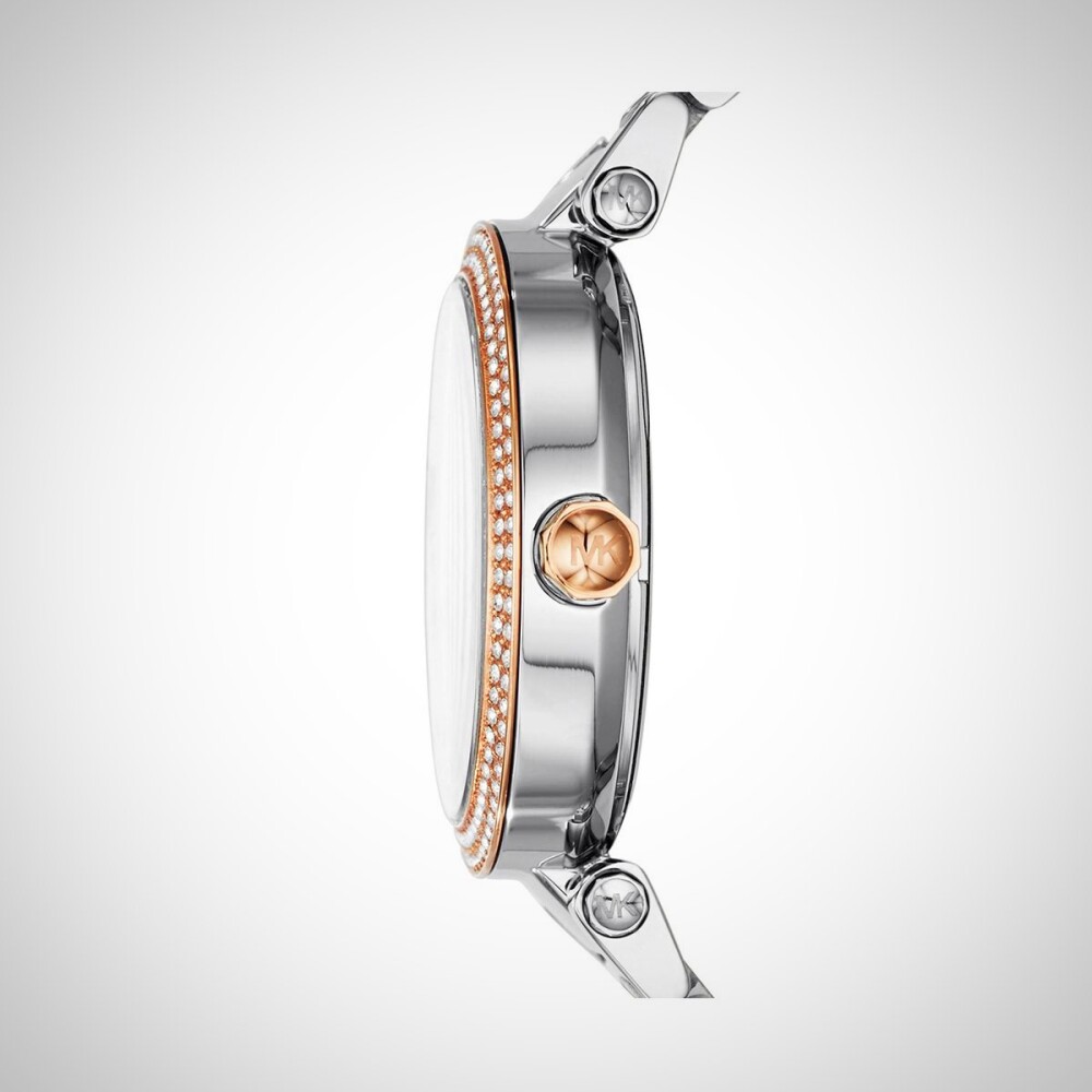 Корпуса и верижката са изработени от благородна стомана с устойчиво на износване розово златисто и сребристо покритие. Циферблата е аналогов в бял цвят с розово златисти индекси и инкрустирани камъни.