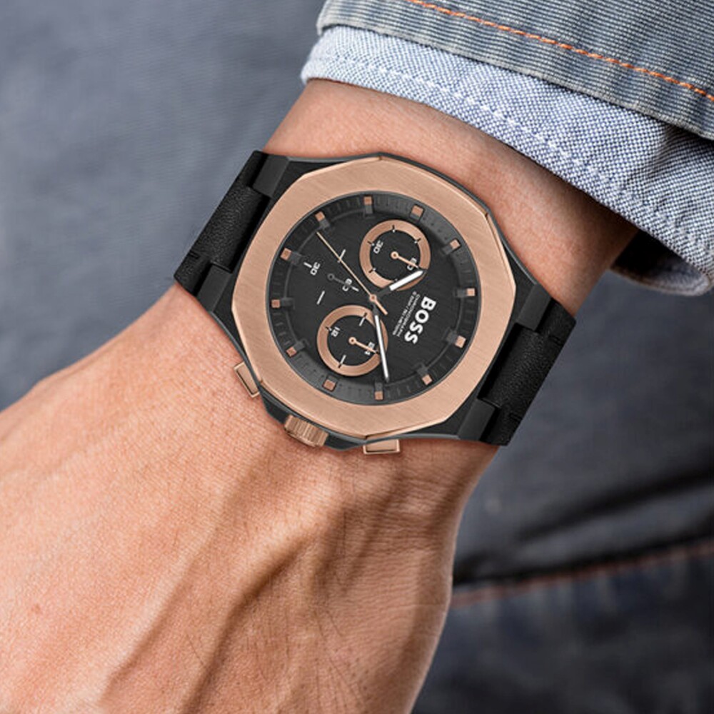 Корпусът е изработен от благородна стомана с устойчиво на износване розово златисто покритие, а каишката е изработена от естествена кожа в черен цвят. Циферблата тип хронограф в черен цвят със златисти индекси.