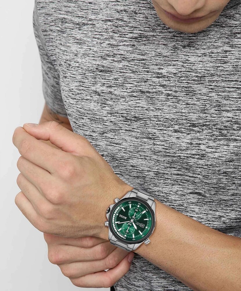 Корпуса и верижката са изработени от благородна стомана с устойчиво на износване сребърно покритие. Циферблата е тип хронограф в зелен цвят със сребристи индекси. Лумунисценция на стрелките.