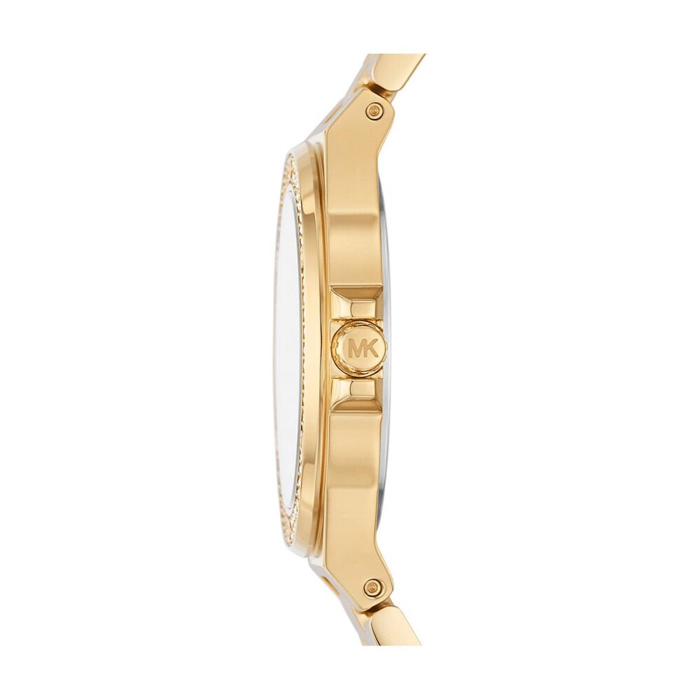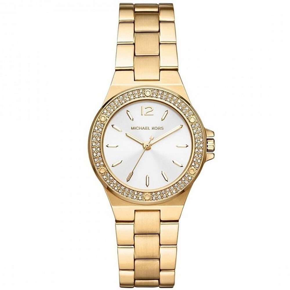 Корпуса и верижката са изработени от благородна стомана с устойчиво на износване златисто покритие.Циферблата е аналогов в бял цвят със златисти индекси.