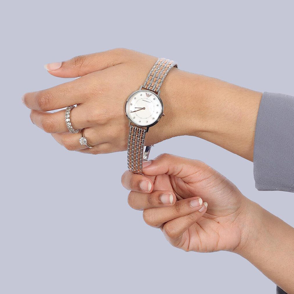 Корпуса е изработен от благородна стомана с устойчиво на износване сребристо покритие. Верижката също е изработена от благородна стомана с устойчиво на износване сребърно и розово златисто покритие. Циферблата е във фин седефен цвят с инкрустирани камъни.