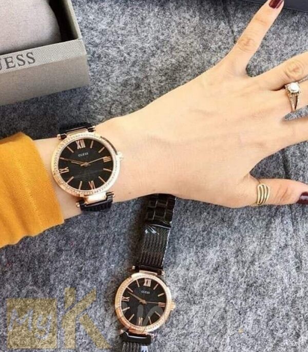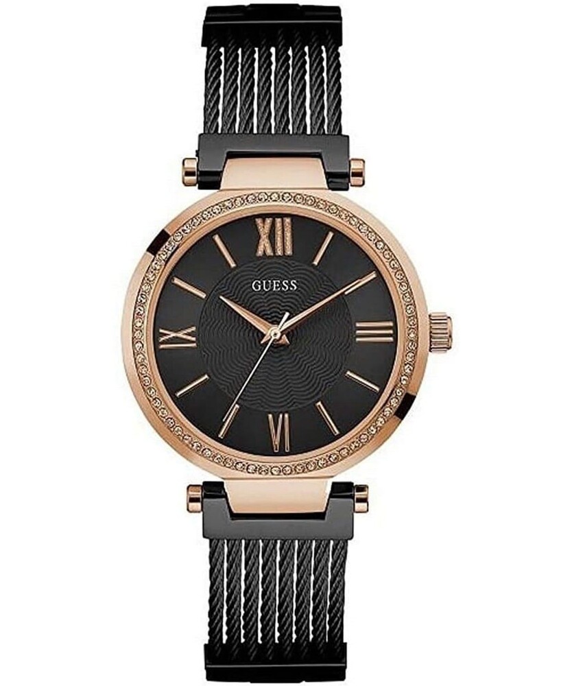 Корпуса и верижката са изработени от неръждаема стомана с устойчиво на износване черно и розово златисто златисто покритие. Циферблата аналогов в черен цвят. Декорация от инкрустирани кристали по безела. Диаметър на корпуса 36 мм.