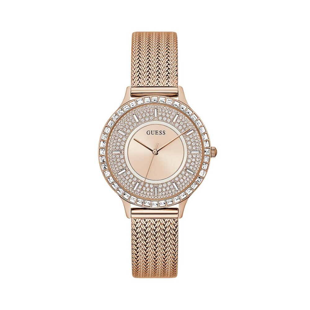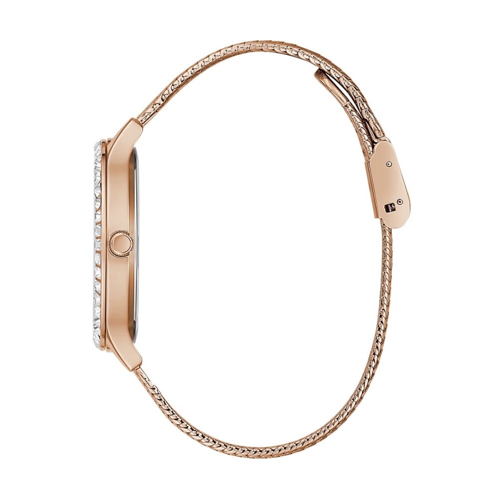 Корпуса и верижката са изработени от неръждаема стомана с устойчиво на износване розово златисто покритие. Циферблата е аналогов в розово златист цвят. Декорация от инкрустирани кристали по безела и циферблата. Диаметър на корпуса 36 мм.
