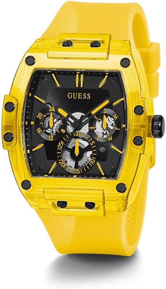 Корпуса е изработен от ацетат в жълт цвят; Циферблата е тип хронограф в черен цвят; Каишката е изработена от полимерен материал в жълт цвят. Диаметър на корпуса 43 мм.