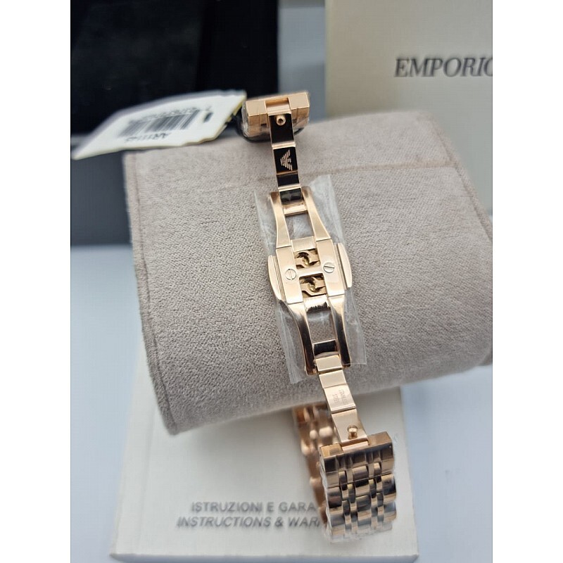 Корпуса и верижката са изработени от благородна стомана с устойчиво на износване розово златисто покритие. Циферблата е аналогов в черно седефен цвят с розово златисти индекси.